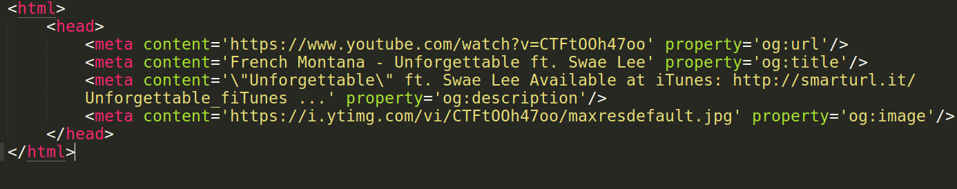 Ora il riceratore Barak ha individuato un metodo per far credere all’utente di aprire un link residente nella famosa piattaforma di condivisione video, invece viene aperto un altro collegamento web. Questo avviene andando a modificare i “meta” tags, esattamente quelli denominati “og:url” , “og:image” e “og:title” e modificandone le “property” attribuite.