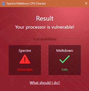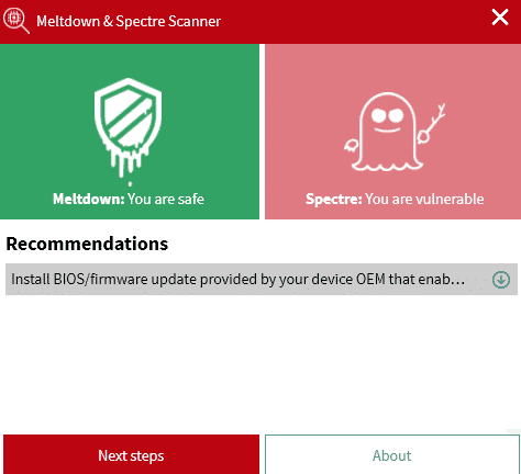 Ashampoo fornisce un interessante strumento chiamato Spectre Meltdown CPU Checker il quale è portabile e permette il controllo in modo accurato e veloce del nostro sistema. Dopo averlo scaricato avviamolo con credenziali amministrative, quindi vedremo la risposta con due icone, una relativa Spectre e l’altra Meltdown.