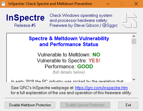 Esiste un altro strumento rilasciato da GRC chiamato InSpectre, il quale dopo il download avvierà in automatico la finestre con i risultati del test.