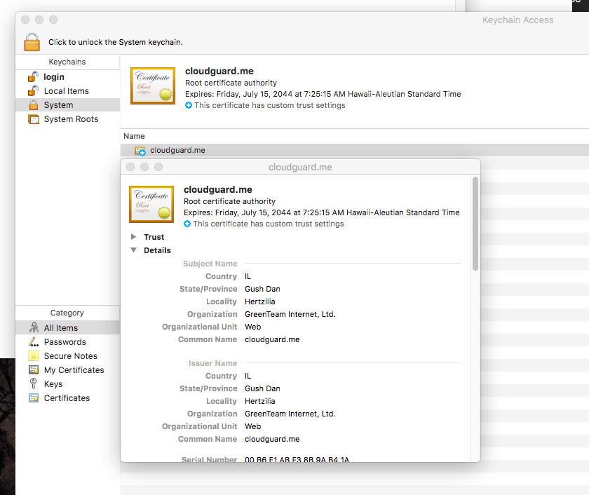 Questo malware installa un certificato di root malevolo nel sistema, emesso da cloudguard.me, dopo di che cambia le impostazioni DNS di sistema inserendo i record malevoli dirottando così il traffico internet. Oltre a questo il malware presenta queste caratteristiche aggiuntive: