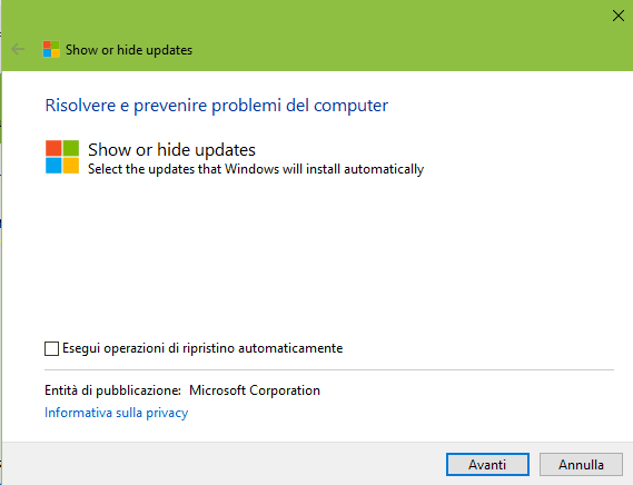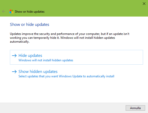 Se in futuro vogliamo abilitarne l’installazione basterà avviare il medesimo strumento, quindi scegliere Show Hidden Updates > quindi deselezionare l’aggiornamento e fare Avanti (o Next)