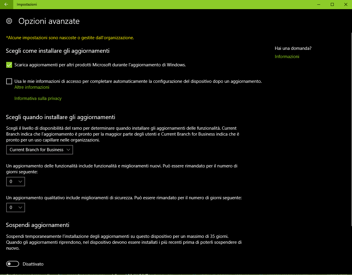 Da impostazioni > Aggiornamenti e Sicurezza > Windows Update > andiamo nella impostazioni avanzate Impostazioni Aggiornamento.