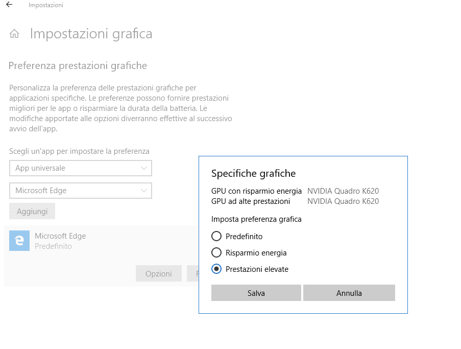 Da start > apriamo le Impostazioni > Sistema > Schermo > impostazioni grafica > scegliamo App Universali > aggiungiamo Microsoft Edge (come da immagine)