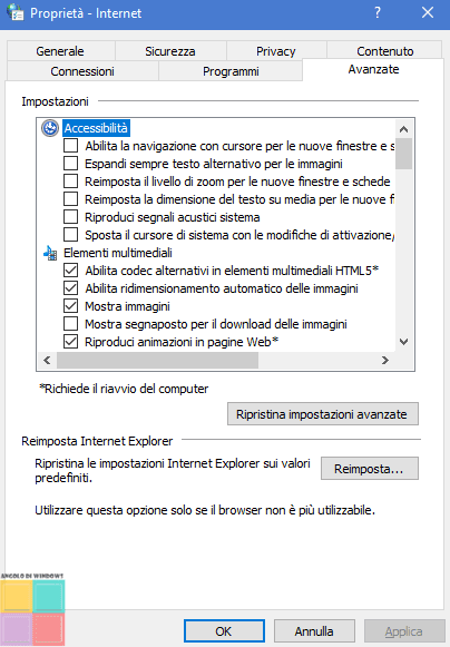 Premere i pulsanti WIN + R > digitare “inetcpl.cpl” e dare invio > dalla scheda Avanzate > scegliere Reimposta