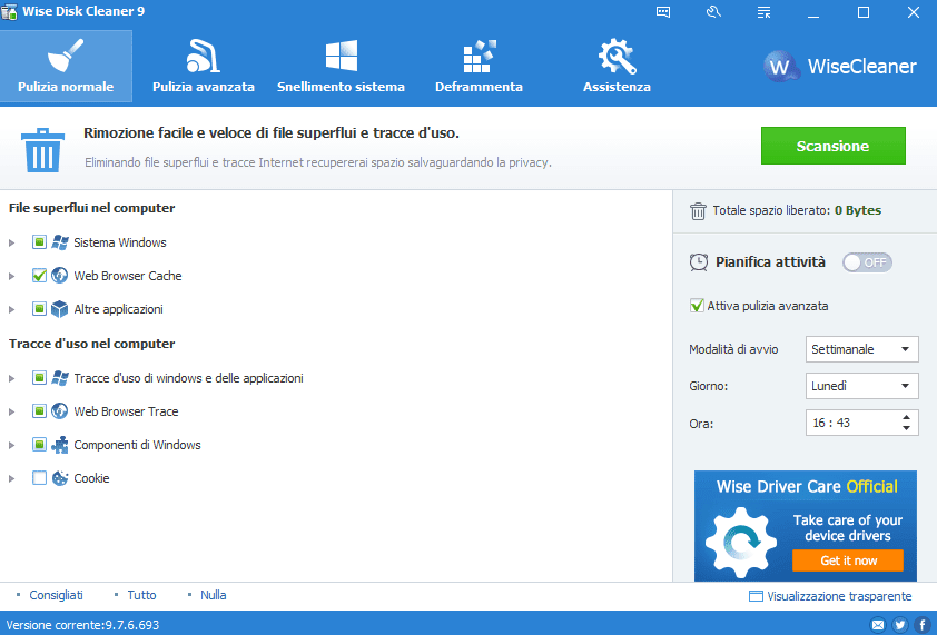 Questo software offre le funzionalità di pulizia dei file temporanei, ricerca approfondita di file non utili e possibilità di pianificare la pulizia del disco.