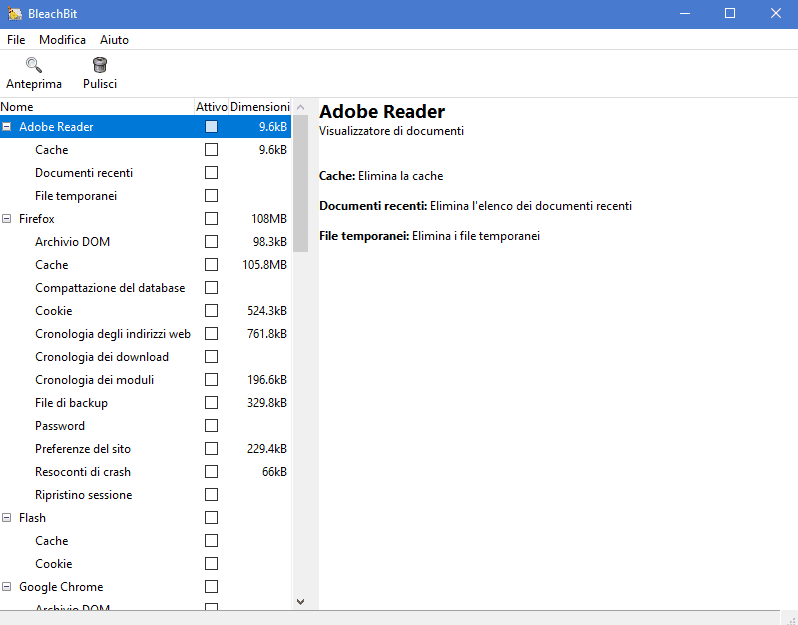 Questo piccolo strumento è gratuito e risulta molto semplice da usare: infatti dopo l’installazione dalla schermata principale possiamo spuntare le voci che vogliamo ripulire, cliccando su Anteprima possiamo aver un idea di quanti file è possibile eliminare.