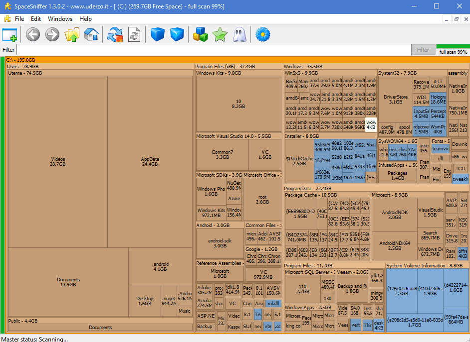 SpaceSniffer è diverso da WinDirStat: infatti l’interfaccia si basa maggiormente sulla suddivisione grafica, in minor modo ricalca l’idea di WinDirStat ma risulta sicuramente più chiara e dettagliata.