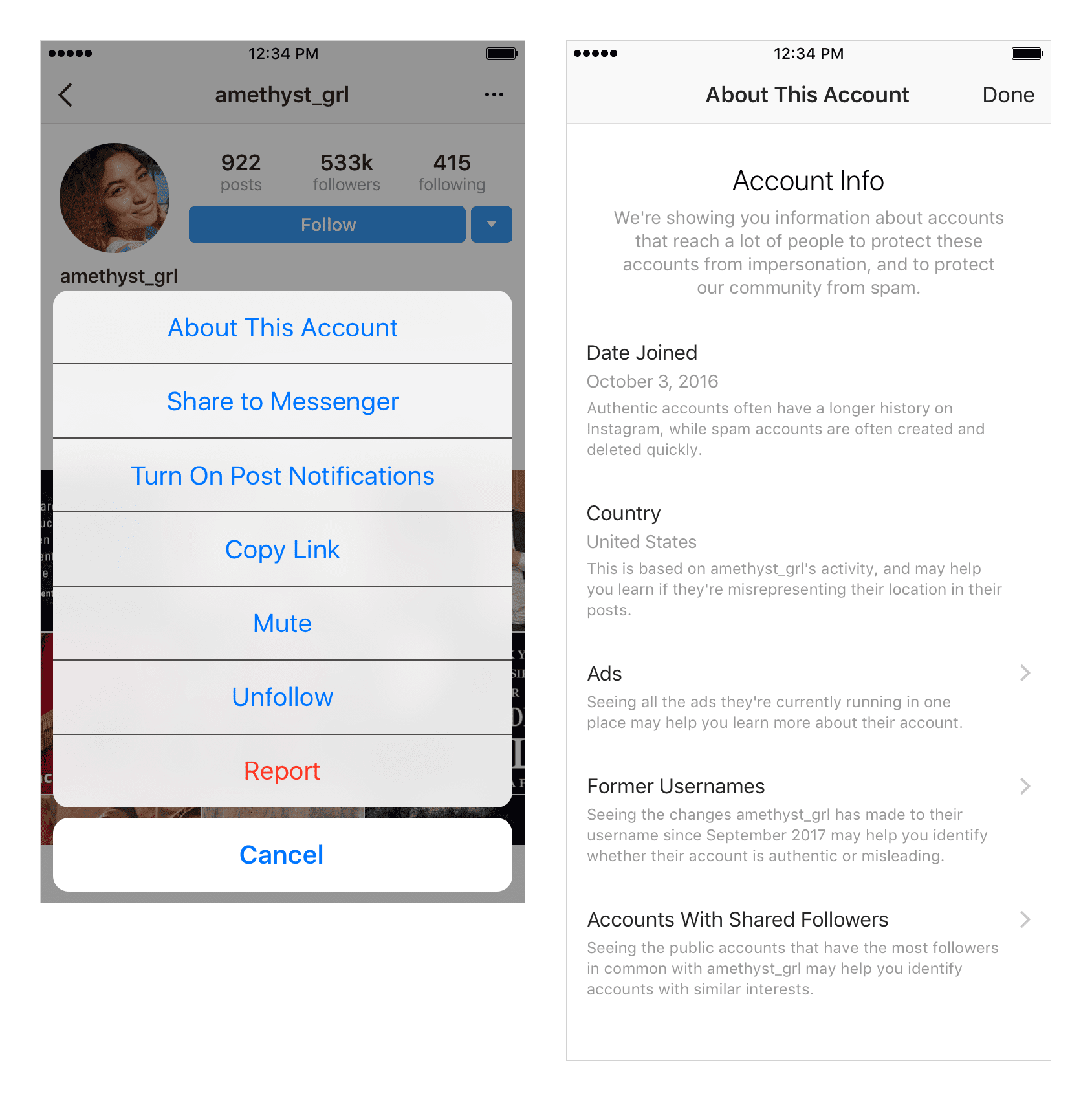 Questa voce sarà una sorta di “Maggiori informazioni su” che permette di verificare l’autenticità di account, ad esempio, con migliaia di follower e sarà possibile quindi vedere alcuni dati supplementari come la data di creazione dell’account, il paese dove è stato creato, i cambi di username fatti negli anni e le eventuali pubblicità attive inerenti l’account.