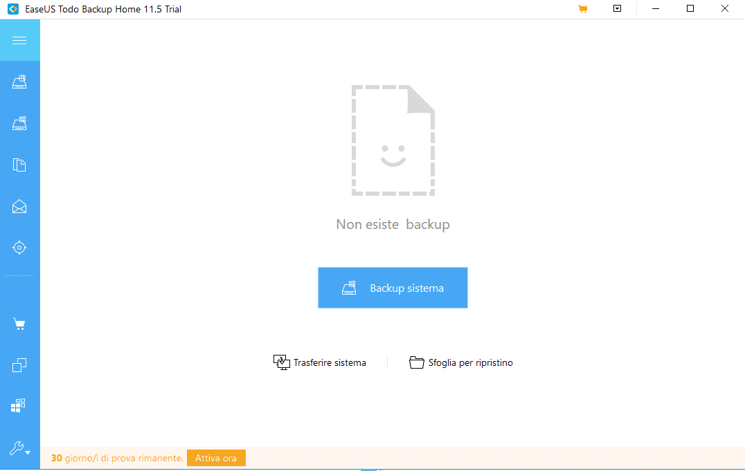 Il primo avvio è rapidissimo, e permette di iniziare immediatamente a operare con il programma. Anche se graficamente si presenta un po’ spartano, sopra la scritta “non esiste backup” abbiamo una faccina sorridente, che rende il programma più piacevole da utilizzare. Possiamo interagire con le tre icone centrali oppure con quelle laterali.