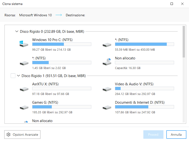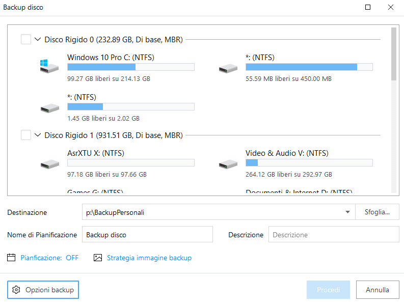 Analizziamo alcune utili funzioni del programma. Possiamo, per esempio, scegliere di fare un backup di intere partizioni dei nostri preziosi Hard Disk e SSD. Basterà selezionare l’unità disco da salvare e cliccare su Procedi.