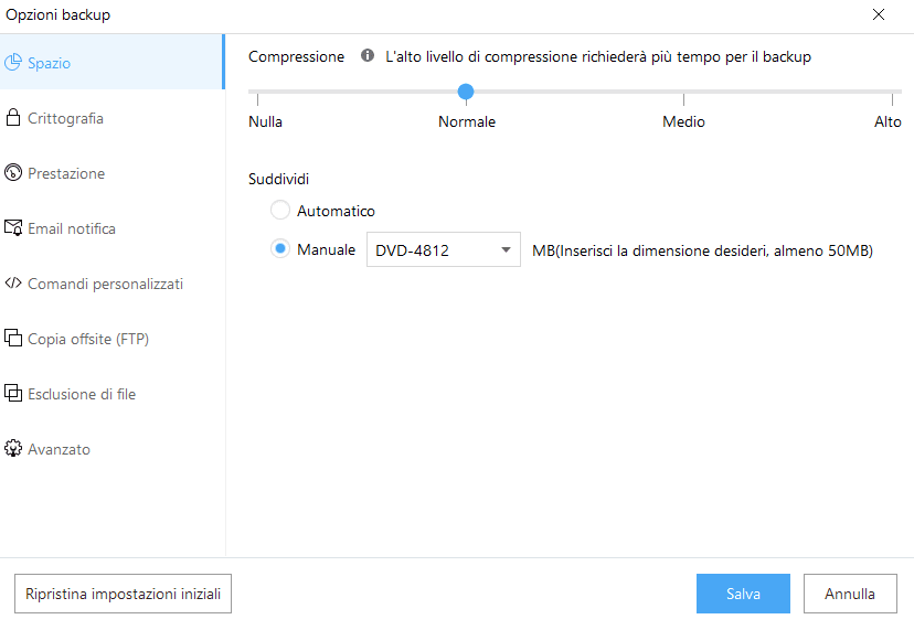 Interessante la prima voce, che ci permette di scegliere la qualità della compressione (maggiore sarà, meno spazio sarà occupato ma più servirà sia per salvare sia per ripristinare i nostri dati).