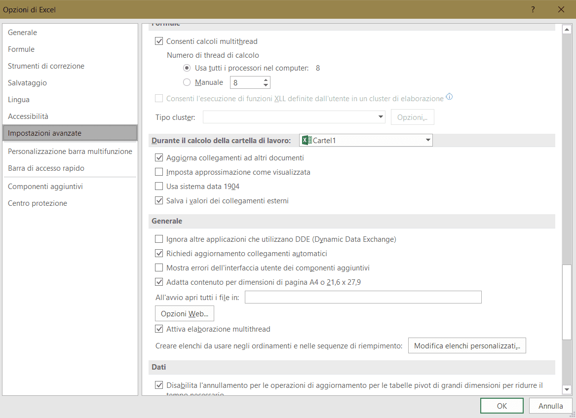 Il primo step è verificare che la spunta relativa il DDE NON sia spuntata. Da File apriamo le Opzioni > Impostazioni Avanzate > sotto la voce Generale spuntare la voce “Ignora altre applicazioni che utilizzano DDE (Dynamic Data Exchange)” come da immagine seguente: