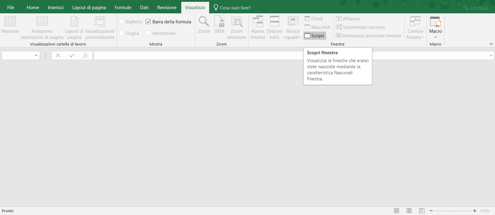 In alcuni casi può essere che la causa sia una semplice “invisibilità” della finestra, ovvero che Excel l’abbia nascosta. Per verificarlo aprire il menù Visualizza e cercare la voce Scopri, come da immagine.