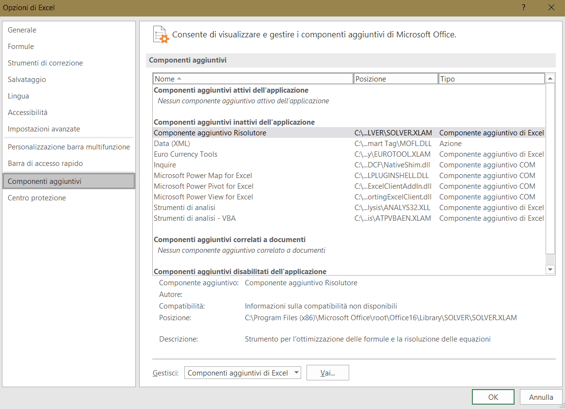Un altro passo è quello di verificare i componenti aggiuntivi attivi da Opzioni > Componenti Aggiuntivi (applicare stessa procedura anche per Componenti Aggiuntivi COM) e vedremo la seguente schermata: