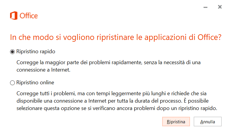 Alla finestra che vedremo consigliamo di eseguire un Ripristino Online, in quanto può correggere con maggior successo il problema evidenziato.