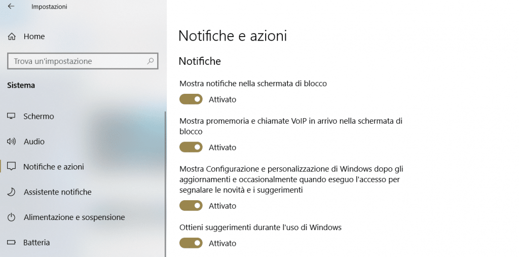Per disabilitare questi suggerimenti aprire le Impostazioni > Sistema > scegliere Notifiche e azioni > disabilitare le voci “Mostra configurazione e personalizzazione di Windows dopo gli aggiornamenti e occasionalmente quando eseguo l’accesso per segnalare le novità e i suggerimenti” e “Ottieni suggerimenti durante l’uso di Windows.