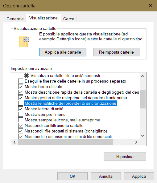 Disabilitare messaggi in Esplora Risorse