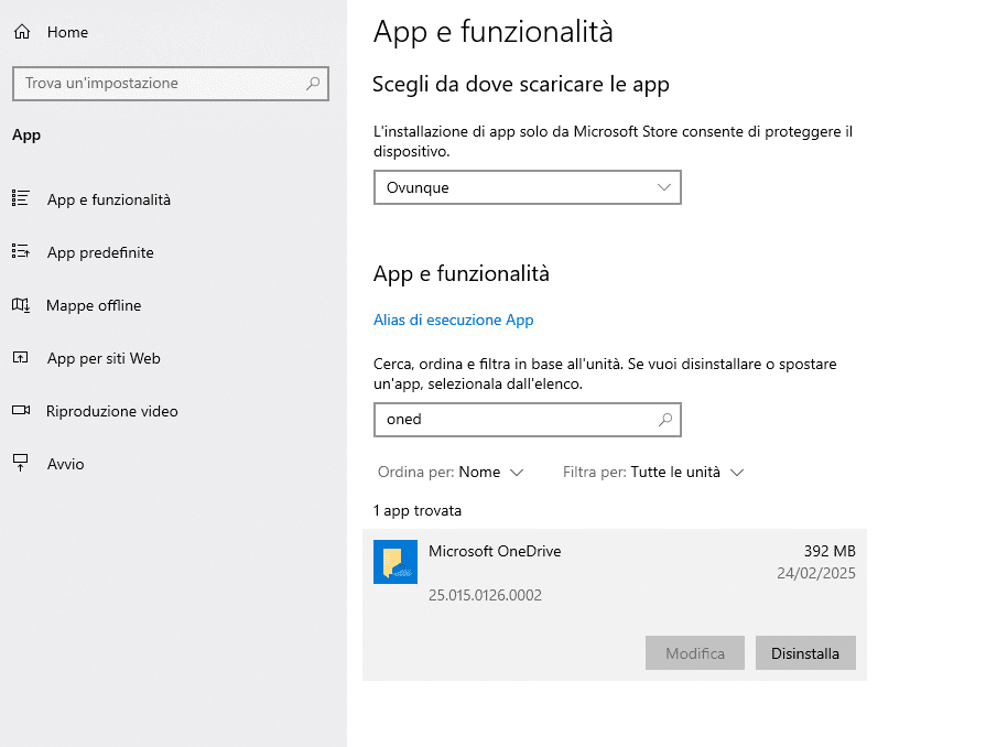 Un ulteriore soluzione è rimuovere completamente lo strumento e reinstallarlo, per farlo premere i pulsanti WIN + X ed aprire App & Funzionalità (o App Installate), da qui cercare la voce relativa il servizio cloud di Microsoft e scegliere Disinstalla.