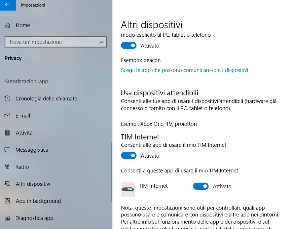 Da start aprire le Impostazioni quindi scegliere Privacy, ora cercare la voce Altri dispositivi e abilitare la voce “Consenti alle app di usare il mio TIM Internet“, ovviamente il nome cambierà in base all’operatore utilizzato.