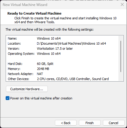 9. Ora puoi personalizzare ulteriormente le impostazioni hardware se necessario, ma le impostazioni predefinite sono generalmente sufficienti. Fai clic su Fine e in automatico la macchina si avvierà. La macchina virtuale inizierà a caricare Windows 10 dall’ISO.