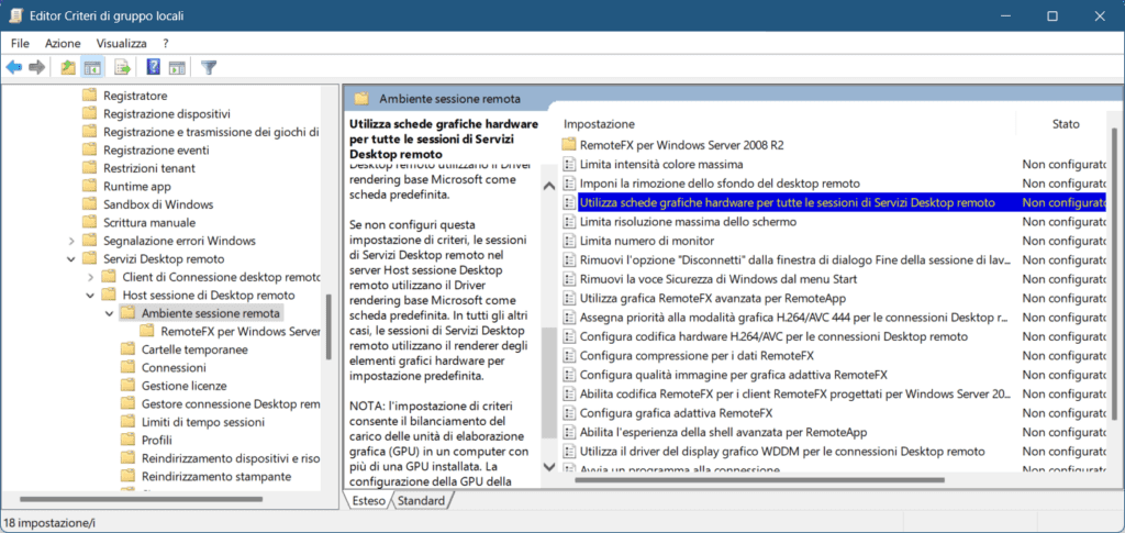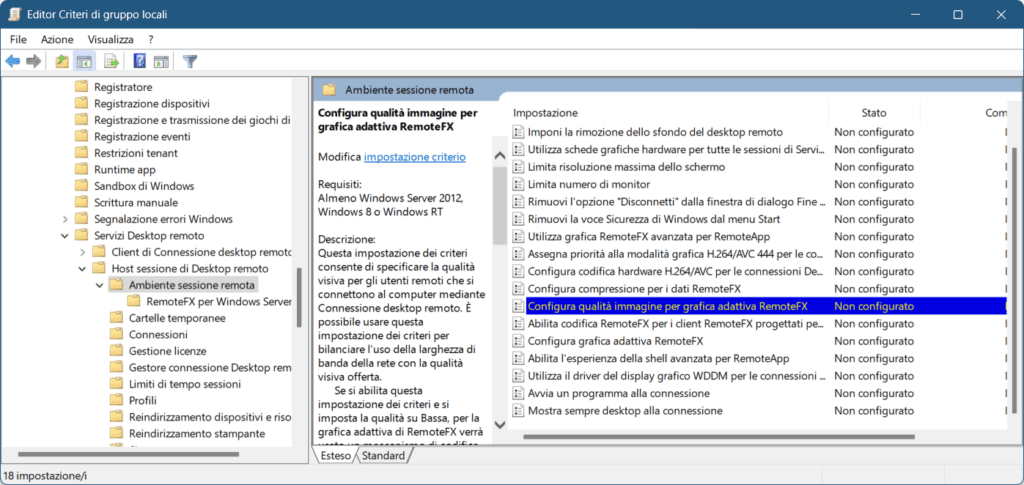 Configurazione Computer > Modelli Amministrativi > Componenti di Windows > Servizi Desktop remoto > Host sessione desktop remoto > Ambiente sessione remota - Modifica le seguenti impostazioni: