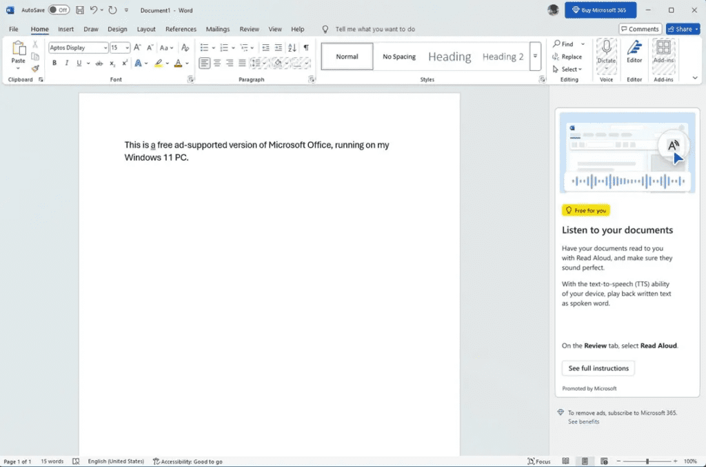 La nuova versione desktop gratuita di Microsoft 365 mantiene il concetto di accessibilità con supporto pubblicitario, ma lo porta all’intera suite di applicazioni Office, includendo tutti i software tra cui Word, Excel e PowerPoint. Gli utenti possono ora creare, modificare e salvare documenti. L’unica limitazione non è consentito il salvataggio locale e i file devono essere per forza archiviati su OneDrive, nei 5 GB del piano gratuito.