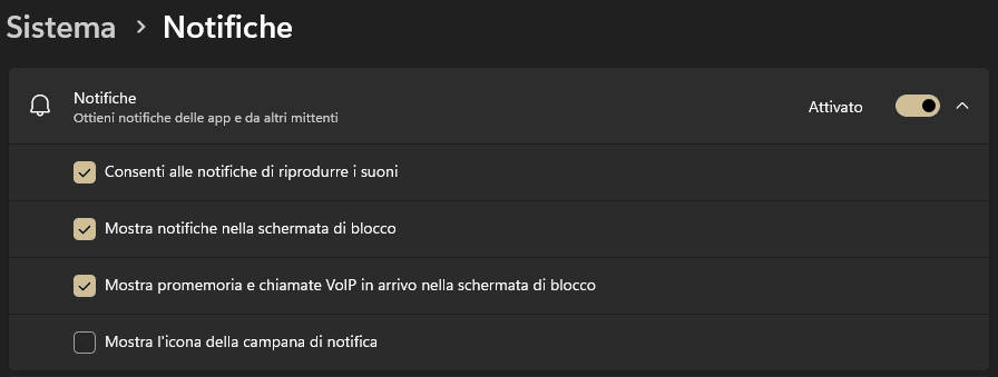 - Apri la linguetta vicino alla voce Notifiche.