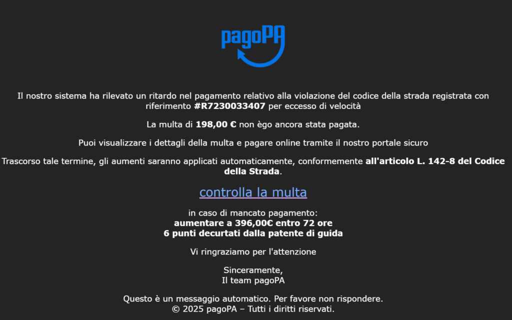 Sfruttando il nome di pagoPA, il sistema ufficiale per i pagamenti verso la Pubblica Amministrazione, i truffatori inviano false e-mail che simulano avvisi di multe non pagate, cercando di indurre i cittadini a cliccare su link malevoli o a fornire dati sensibili.