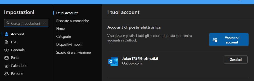 - In Outlook: File → Impostazioni Account → Account di posta corrispondente a quello usato in Teams
