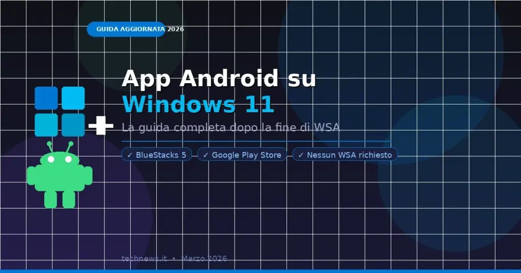 Microsoft ha terminato il supporto per WSA e per l’Amazon Appstore su Windows nell’ottobre 2024. Se incontri guide online datate 2022 o 2023 che consigliano di installare il Windows Subsystem for Android, ignorale: sono obsolete e non funzioneranno su nessuna installazione aggiornata di Windows 11. La strada corretta oggi è l’emulazione tramite software di terze parti.